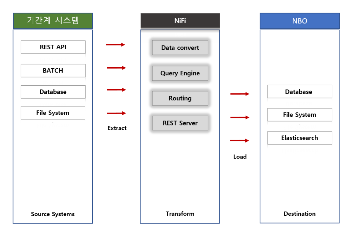 위의 이미지와 같이 소스 시스템으로부터 추출(Extract), 변환(Transform), 로드(Load) 역할을 NiFi를 활용하여 구성할 수 있습니다.
