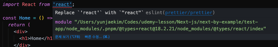 Airbnb ESLint 스타일인 single quote로 Prettier를 수정해줄 필요가 있다.