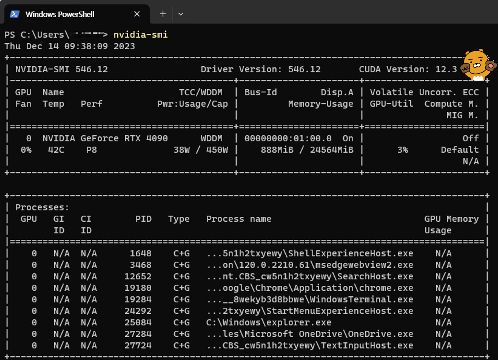 CUDA 버전은 Power Shell 에서 nvidia-smi 멍령어를 치면 우측 상단에서 적합한 버전을 알려줍니다.