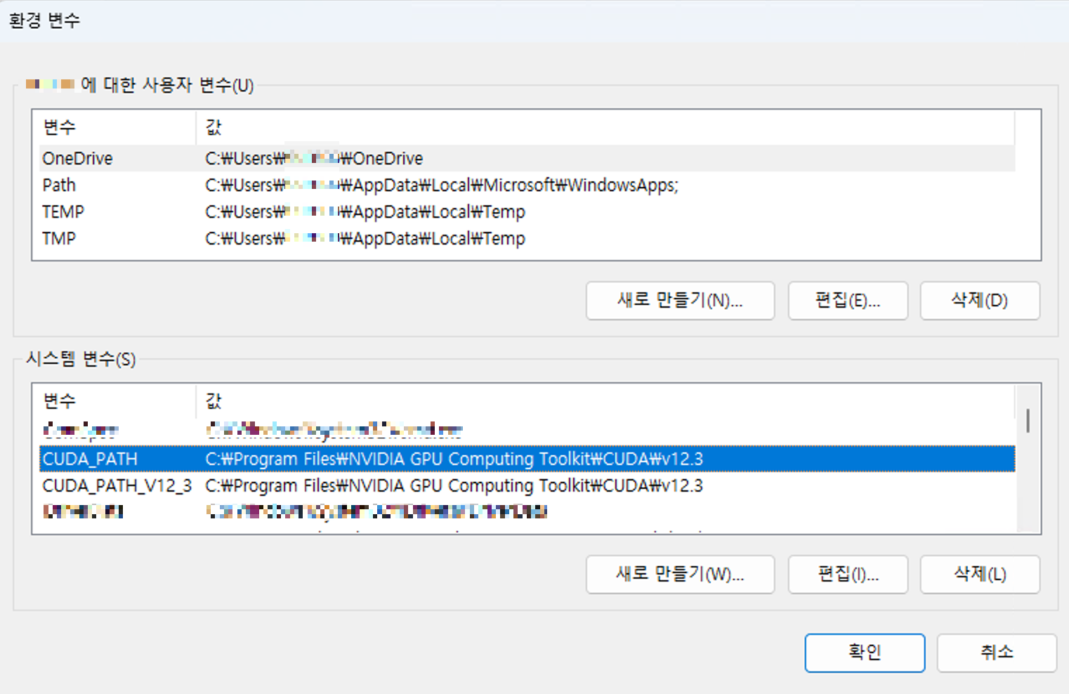 또 시스템 환경변수에 아래와 같이 CUDA_PATH 와 CUDA_PATH_{version} 이 등록됩니다.