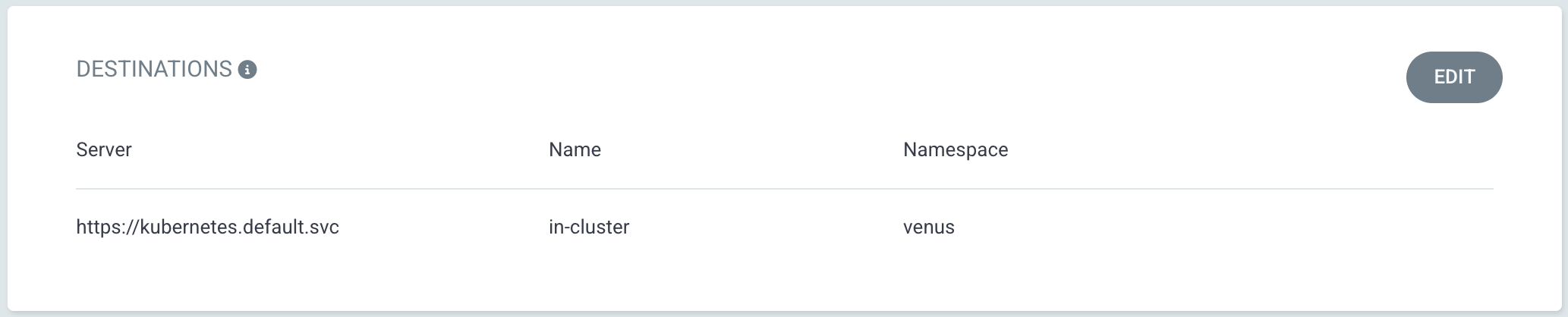 DESTINATIONS에서 다음과 같이 K8s의 Server와 클러스터의 namespace와 동일한 이름으로 설정해준다.