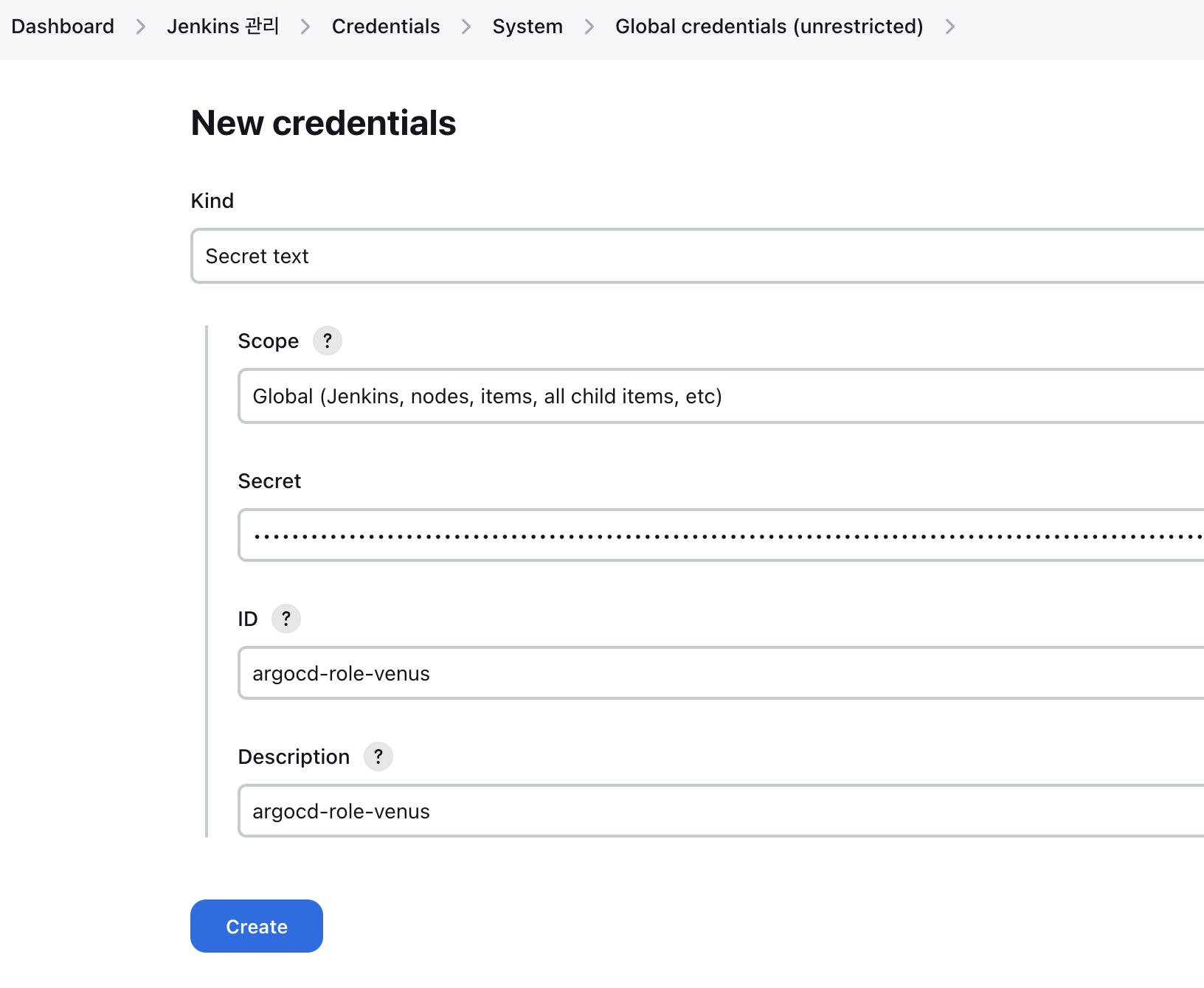 위에서 argocd 에서 설정한 role name과 token을 브라우저에서 Jenkins 에 접속한 후에