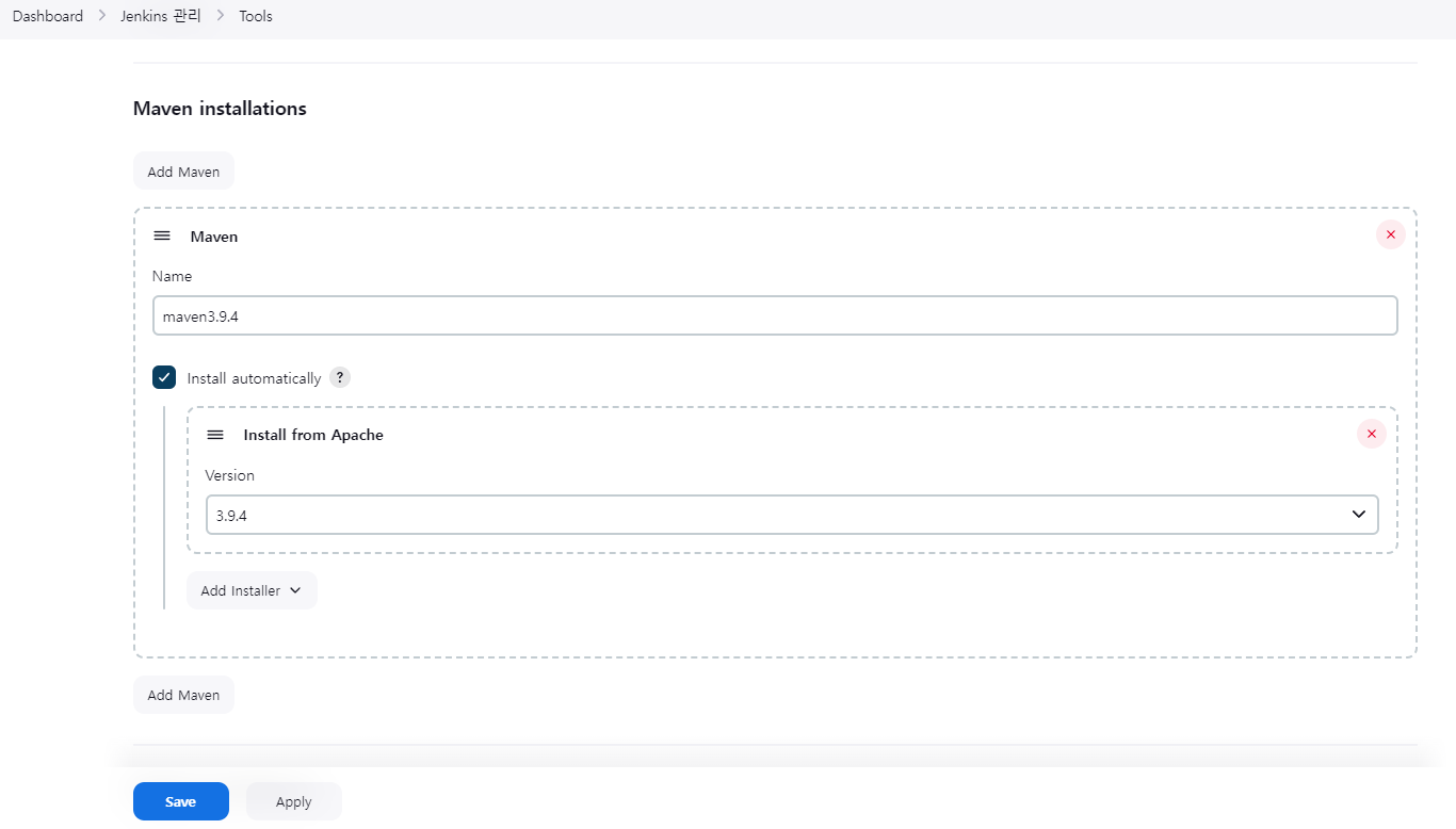 Jenkins 사이트에 접속해서 Jenkins관리 > Tools에서 Maven 설치