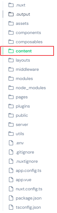 프로젝트에 @nuxt/content 모듈을 설치하고 다음 명령을 사용하여 nuxt.config.ts 에 추가한다.