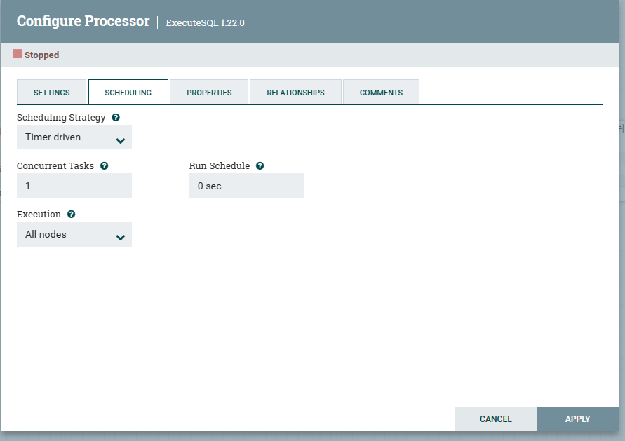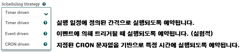 구성된 속성으로는 Scheduling Strategy, Concurrent Tasks, Excution, Run Schedule, Run Duration이 있습니다