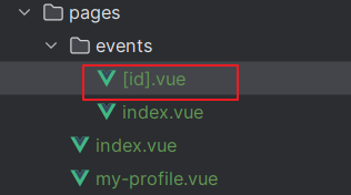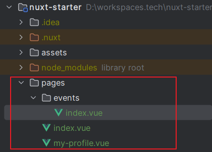 위 내용에서 root URL 이 생성되는 구조를 보면 events.vue 파일도 디렉터리 구조로 변경할 수 있음을 알 수있다.. pages 디렉터리에 events 디렉터리를 만들고 events 디렉터리에 index.vue 파일을 만들어 event.vue 파일의 내용을 그대로 옮기자. 디렉터리 구조는 아래와 같다.