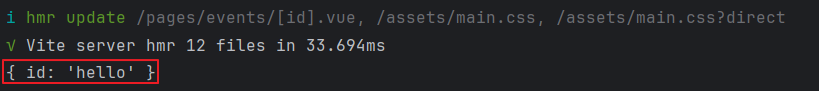 파라미터를 기반으로 하는 동적 라우팅에 대해 알아보자, URL 경로는 동적일 때가 많다. 보통 List - Item 구조를 URL 로 표현할 때 개별 Item 은 ID 로 구분되는 경우가 많다. 예을 들면 ~/books/1, ~/members/ironman 과 같은 식이다. 이런 방식의 동적URL 은 동적경로(흔히 파라미터를 대괄호로 감싸는 형태로 만든다. /pages/event 디렉토리에 [id].vue 파일을 만들자.