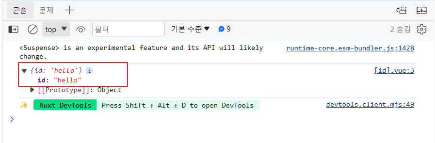 참고로 라우트 경로 뿐만 아니라, Nux App 의 전체의 현재 컨텍스트 상태를 참고해야 될 때가 많다. 이럴 때는 useNuxtApp 을 사용하면 된다. [id].vue 의 소스를 아래와 같이 수정하자.