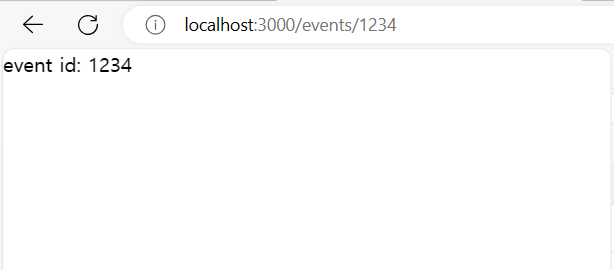 http://localhost:3000/events/1234 를 호출해 보자. 아래와 같이 보일 것이다. 동적 라우팅 페이지를 추가하면 HMR 이 작동되지 않는 경우가 있다. 이럴 경우 서버를 다시 기동해야 한다.