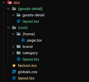 (root)에는 기본 layout.tsx을 사용, (goods-detail)에는 다른 layout.tsx을 적용하는 방법.