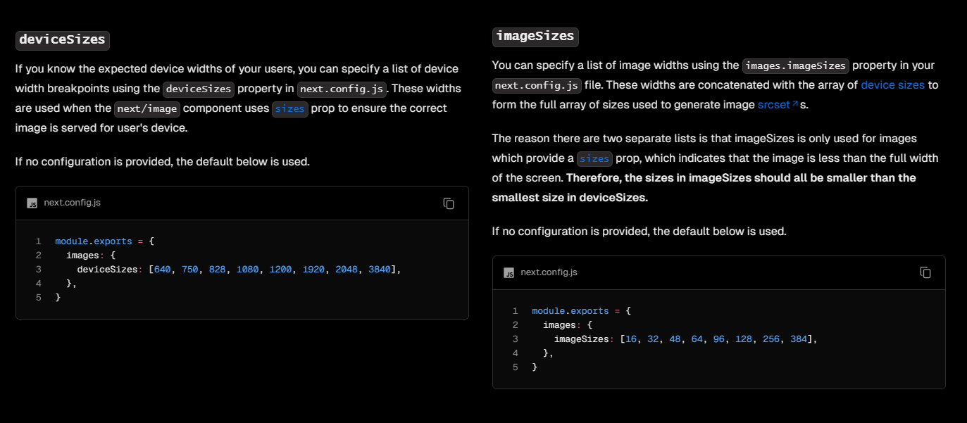 여기서 뷰포트 deviceSizes와 imagesSizes의 설정은 공식 홈페이지의 이미지를 참고하고 넘어가겠습니다.