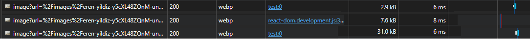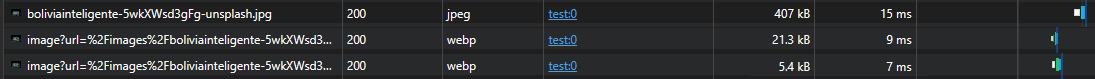 이미지 크기 비교 결과 일반적인 'img' 태그의 이미지는 407kb인 원본 이미지 사이즈만큼 나오는 반면, 'next/image'는 21.3kb 그리고 크기를 고정한 경우에는 5.4kb로 나타났습니다.