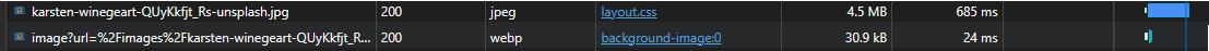 tailwind-bg는 별도의 옵션을 사용하지 않고 이미지를 처리하였고 결과적으로 파일 크기는 4.5MB로 크게 나왔습니다. 반면 nex/image bg는 quality를 90으로 설정하고 fill 옵션을 true로 적용하여 파일 크기가 30.9kb로 나타났습니다.