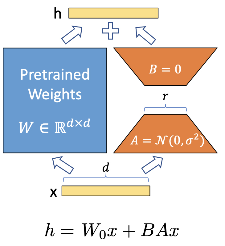 훈련될 각 레이어에 대해, d × k 가중치 업데이트 행렬 ∆W는 낮은 분해 순위 BA로 표현됩니다.