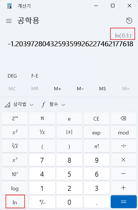 \(log_e(X)\) 인 함수를 특별히 \(ln(X)\) 함수라고 한다. 공학용 계산기를 이용해 \(ln(0.3)\) 을 구해 보자 계산기 버튼에 ln 버튼이 있다.