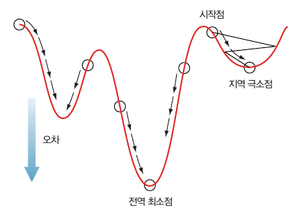 복잡한 오차함수는 여러개의 지역 최소점을 가진 경우가 있다. 우리의 목표는 전역 최소점에 도달하는 것이다.