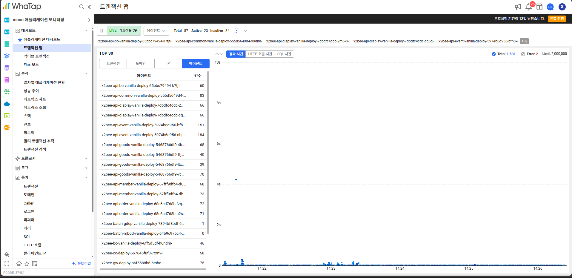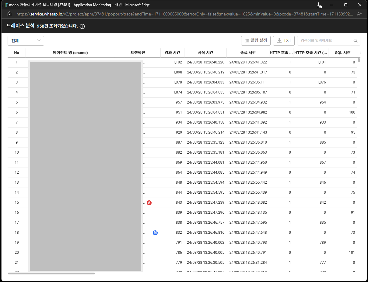 추가로 [애플리케이션 모니터링 > 대시보드 > 트랜잭션 맵] 메뉴에서도 [트레이스 분석 팝업]을 통해서 동일하게 확인 가능합니다.