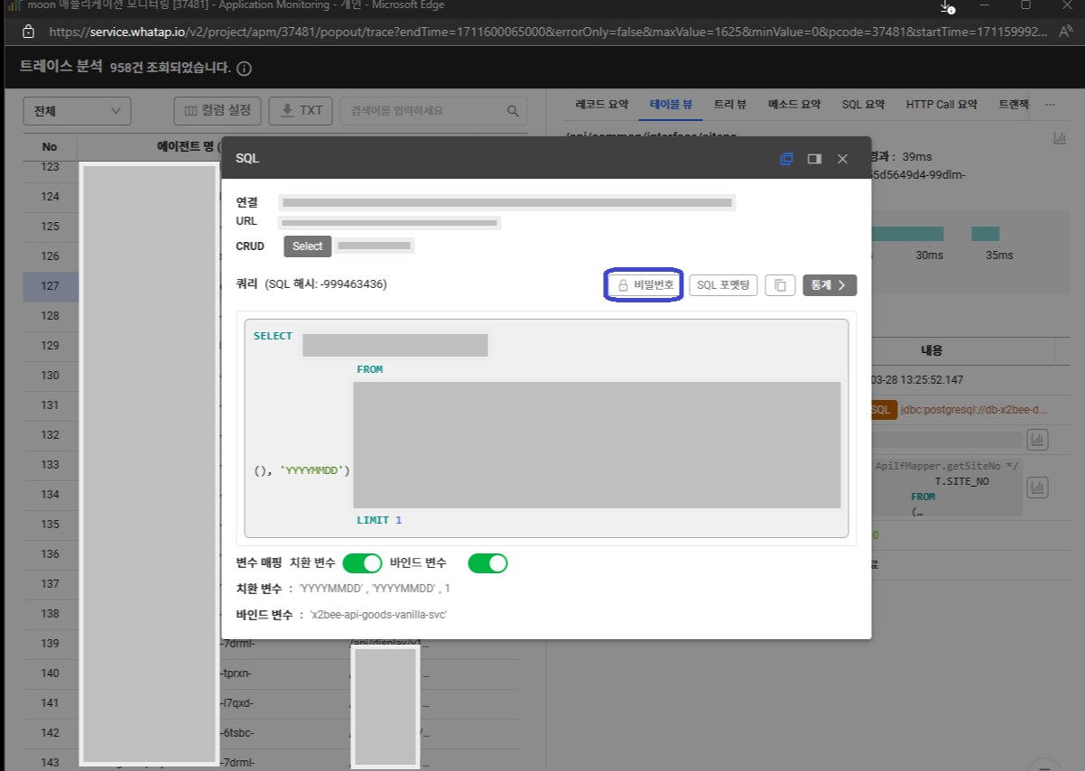 위 이미지는 비밀번호를 입력 후 치환 변수 및 바인드 변수가 on 된 상태입니다.