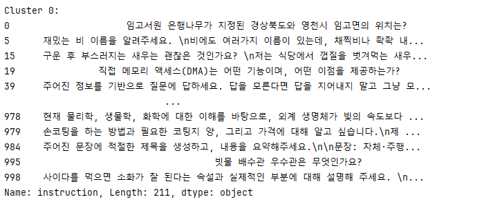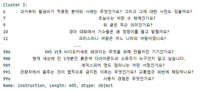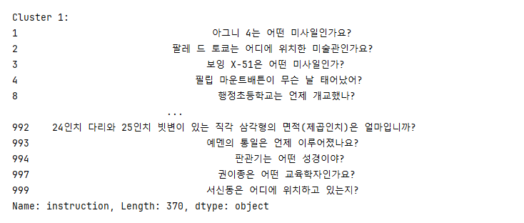 이 클러스터는 개인적으로 생각했을 때 문장 생성에 오류가 발생한 거 같다. 지나치게 구체적인 질문이 작성된 것으로 보인다. 이런 데이터는 버리는게 나을 듯 싶다.