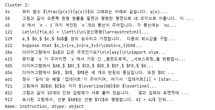 이 클러스터는 눈으로 봐도 파악되는, 수학적 문제 또는 복잡한 문제 해결을 요구하는 질문들로 구성되 있는 거 같다. 추상적인 사고와 고도의 분석을 필요로 하는 문제들을 포함하고 있다.