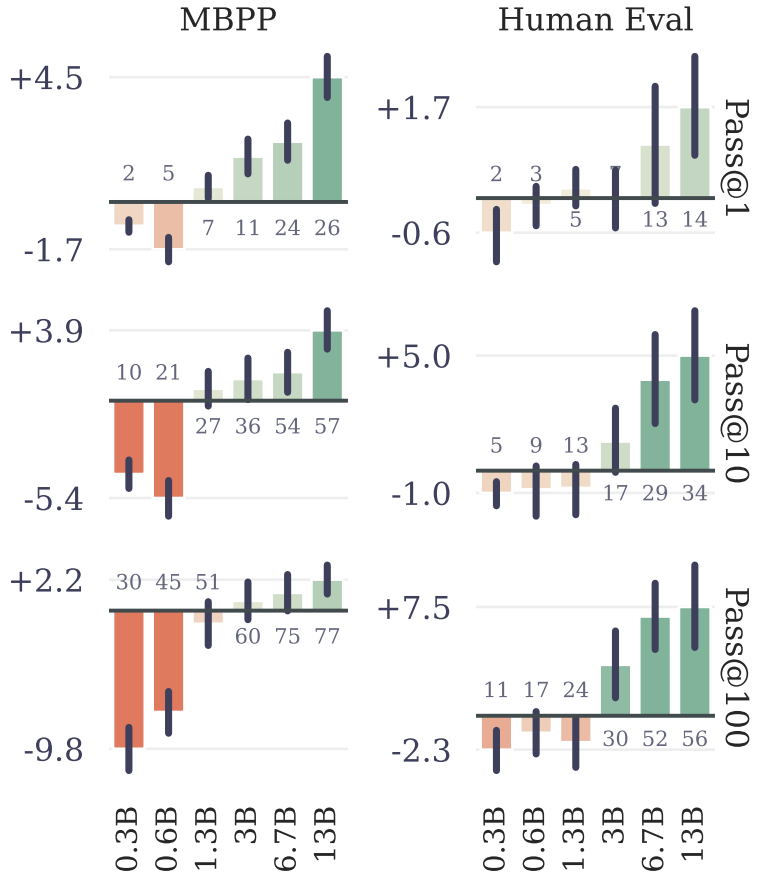 본 논문에서 제안한 Multi Token Prediction의 경우, Model의 Parameter의 수가 크면 클수록 성능 지표가 개선된다.
