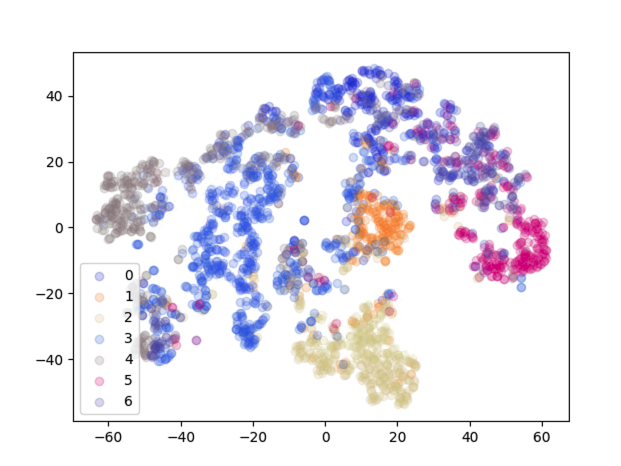 t-SNE 시각화 : 학습된 노드 임베딩을 2차원으로 축소한 후, 노드의 레이블에 따라 색상으로 구분하여 시각화함