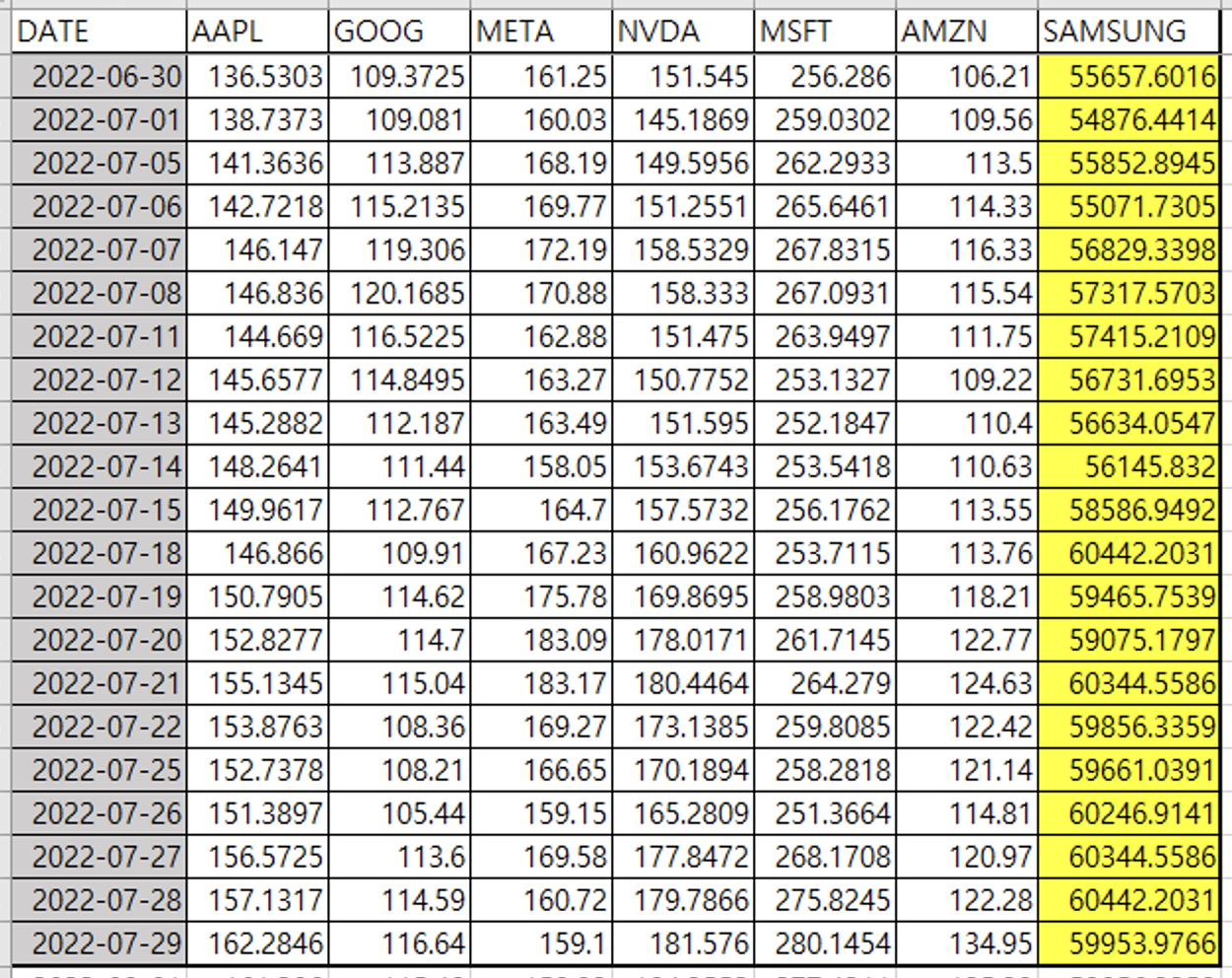 위 데이터는 지도학습을 위하여 각 날짜에 해당하는 애플, 구글, 메타, 엔비디아, 마이크로소프트, 아마존의 주가와 삼성전자 주가를 정리한 데이터입니다. 여기에서 삼성전자 주가와 날짜를 제외한 값들이 [문제]가 되고 삼성전자주가가 [답]이 됩니다.