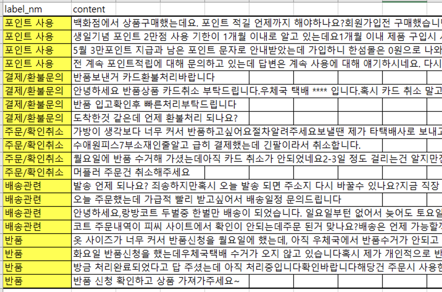 * 쇼핑몰 Q&A 데이터를 이용한 고객 문의 예측 데이터셋 (분류)