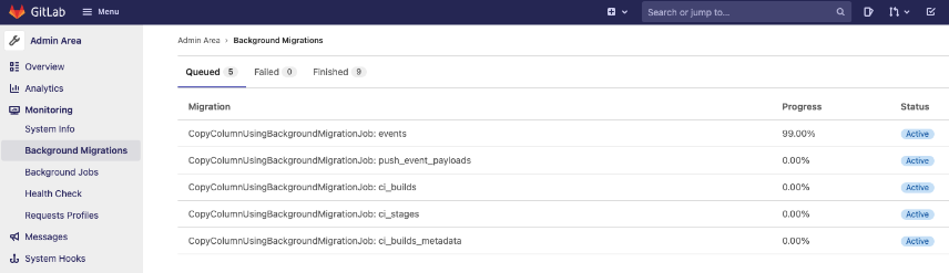 14버전부터는 Admin 메뉴 > Monitoring에 다음과 같이 아예 Background Migrations라는 메뉴가 따로 생겼다.