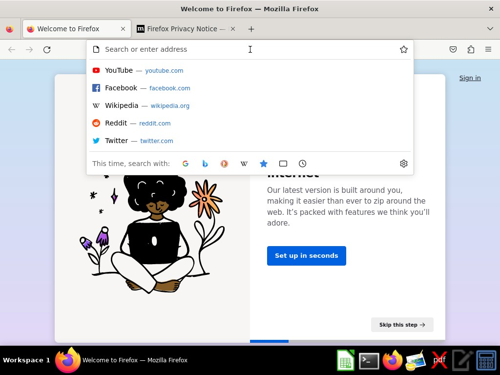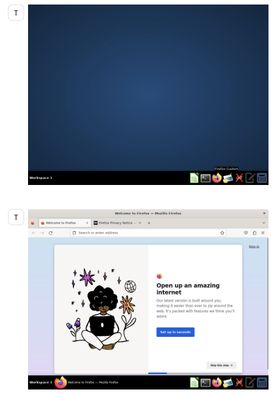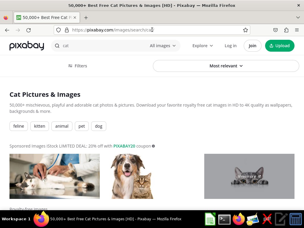 "text": "I see the Firefox icon in the taskbar. Let's click on it and search for cat images:"