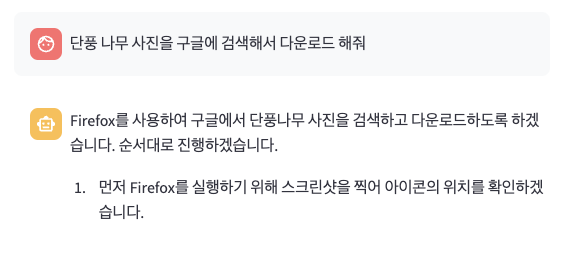 여기 까지는 당연히 똑같다 하지만 프롬프트에 "구글"에서 검색하라는 명령을 추가했기 때문에 구글에 접속을 먼저한 후 검색하는것을 볼 수 있다.