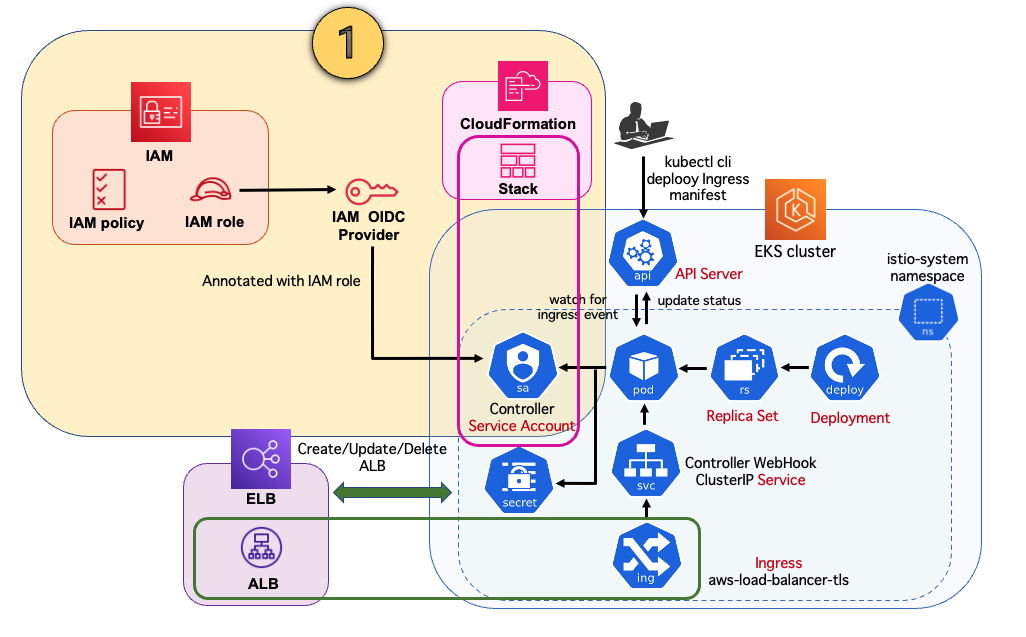 아래 그림에서 노란색 영역으로 보여지는 IAM policy, IAM role, IAM OIDC provider, Service Account를 우선 설치할 것이다.