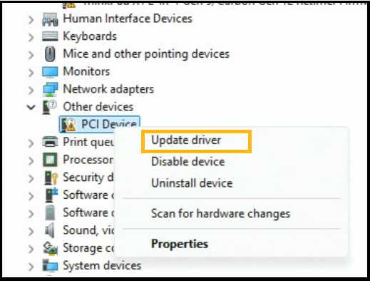 - 다른 장치에서 PCI 장치를 찾습니다. 마우스 오른쪽 버튼으로 클릭하고 드라이버 업데이트를 선택합니다.