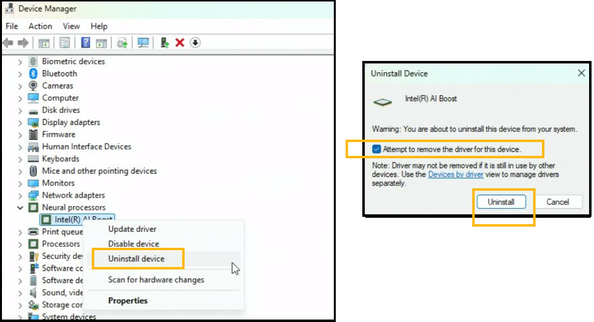 - 장치 관리자 창에서 인텔® AI Boost 마우스 오른쪽 버튼으로 클릭하고 장치 제거를 선택합니다.