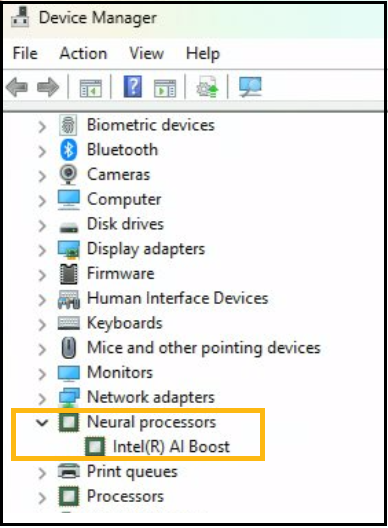 - 신경망 프로세서 아래에 인텔® AI Boost 표시되는지 확인합니다.