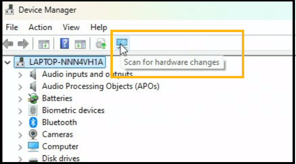 - Device Manage(장치 관리)로 이동하고 Scan for Hardware Changes(하드웨어 변경 사항 검색)를 클릭합니다. 상단 메뉴에 있는 아이콘을 한 번 클릭하면 다른 장치가 표시됩니다.