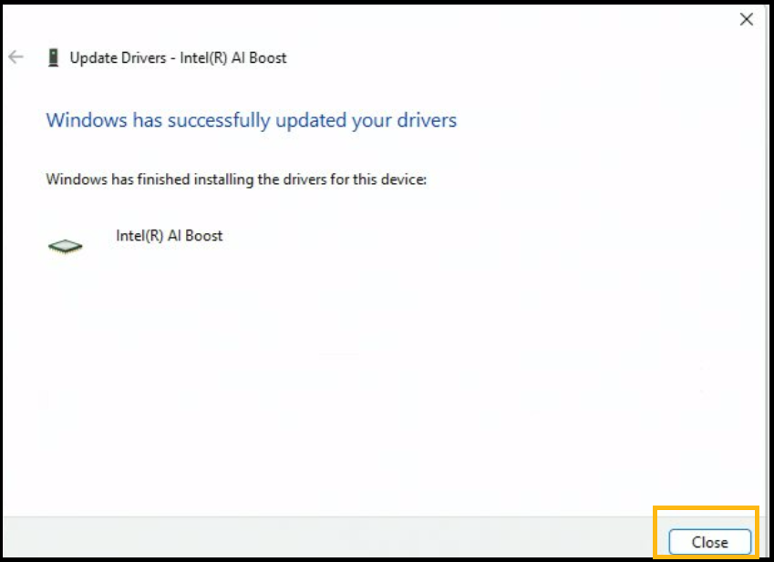 - 드라이버가 올바르게 설치되면 Windows에서 드라이버를 성공적으로 업데이트 했으며 장치 관리 의 신경망 프로세서 아래에 인텔® AI Boost 드라이버가 표시되어야 한다는 다음 창이 표시되어야 합니다.