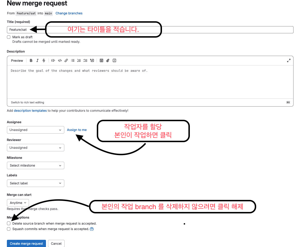 3. 필요한 정보를 기입하고 create merge request 클릭