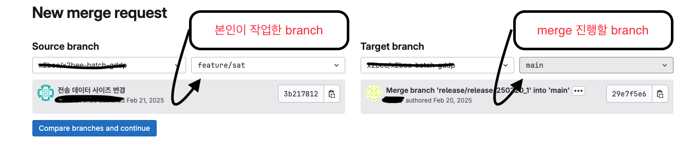2. New Merge request 버튼 클릭하고 아래 그림처럼 셋팅을 하고 Compare branches and continue 를 누릅니다.