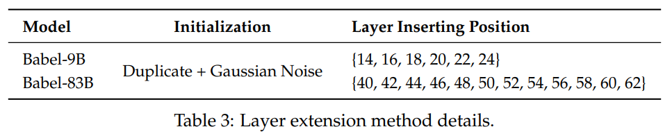 바벨의 경우, 굉장히 많은 수(25개 언어)의 언어를 학습하며 모델의 성능 상한을 높이기 위해서 Qwen2.5B-7B, Qwen2.5-72B-Base의 구조를 활용하여 모델 확장을 통해 파라미터 수를 늘려서 학습하는 방식을 활용했다고 합니다. 특히, 원래의 구조와 동일한 새로운 레이어를 직접 추가하는 구조화된 방법인 레이어 확장을 사용합니다.