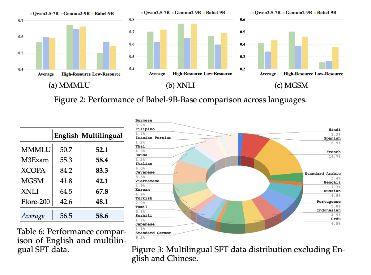 이러한 결과는 Babel이 다국어 이해, 추론, 번역 분야에서 탁월함을 입증하며, 해당 파라미터 범위 내에서 가장 유능한 오픈 다국어 LLM임을 보여줍니다.