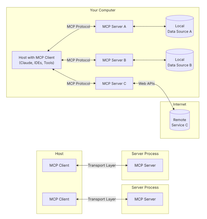 MCP는 Client-Server 아키텍처를 기반으로 LLM 어플리케이션이 데이터 소스와의 원활한 통신을 가능하게 하도록 설계되었는데 특히, 3가지 구성 요소로 이루어졌습니다. (출처 : https://discuss.pytorch.kr/t/deep-research-model-context-protocol-mcp/6594)