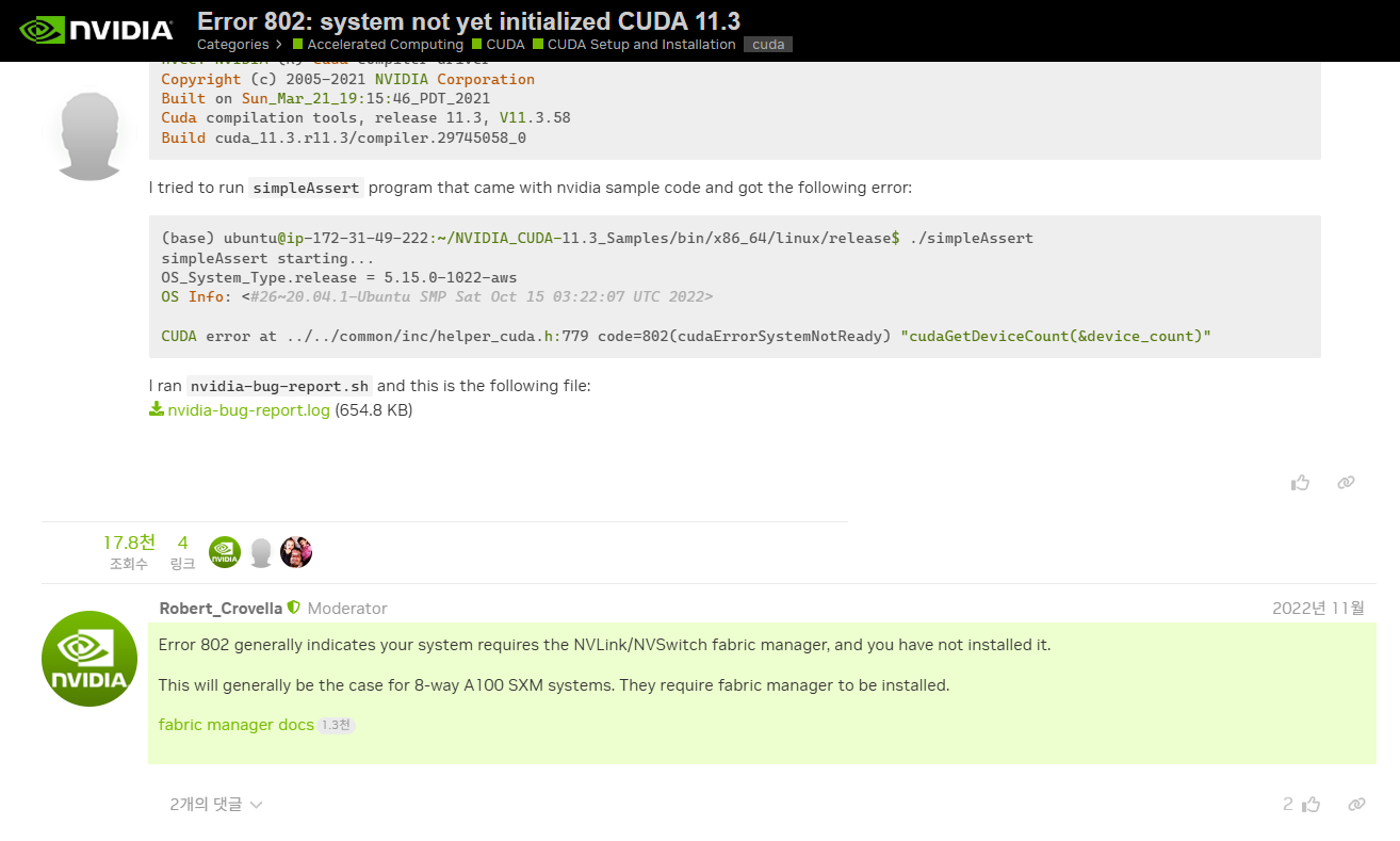 해당 글에서는 802 에러가 아마도 fabric manager와 관련된 것인 것이라고 이야기한다.