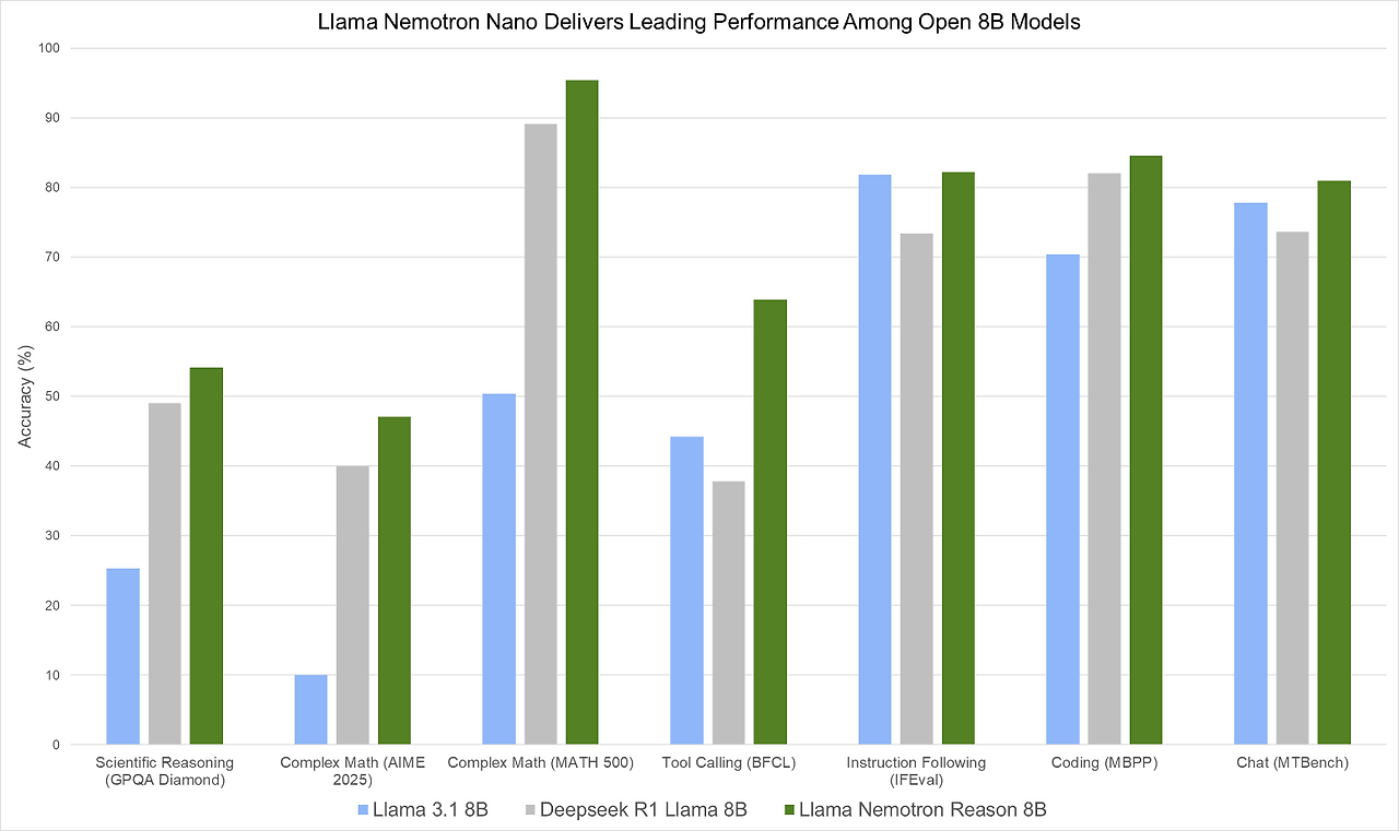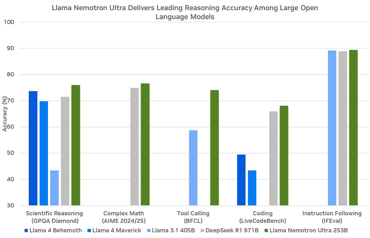 - Llama Nemotron Ultra 253B 모델은 253B 파라미터로, 상위 수준의 오픈 추론 모델들과 맞먹거나 뛰어난 성능을 보이며 높은 처리량과 도구 호출 능력을 함께 제공합니다.