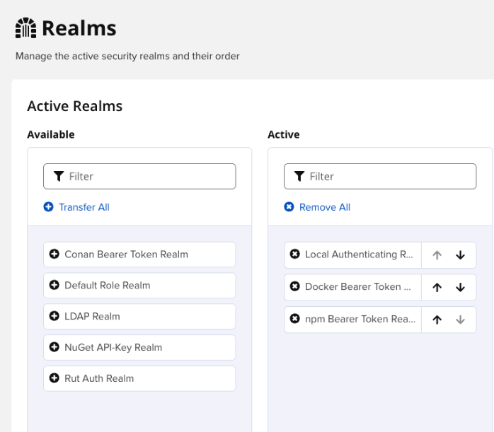 Nexus에서는 보안관리 기능을 통해 접근 제어나 인증 토큰 정책을 설정할 수 있습니다. NPM 레지스트리의 경우 npm Bearer Token Realm을 적용하여 보다 안전하게 패키지를 배포하고 설치 관리할 수 있습니다.