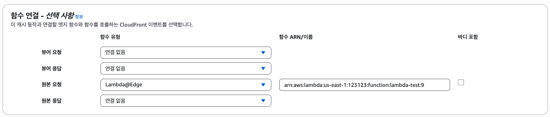 - Lambda ARN을 입력하고 마지막에 콜론(:)과 Public 버전 번호를 입력한다. (ex. arn~~~:9)