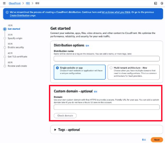 Step2. Cloudfront배포 세팅 : 도메인 주소는 AWS계정의 Route53에 등록되어 있어야함.