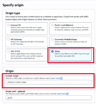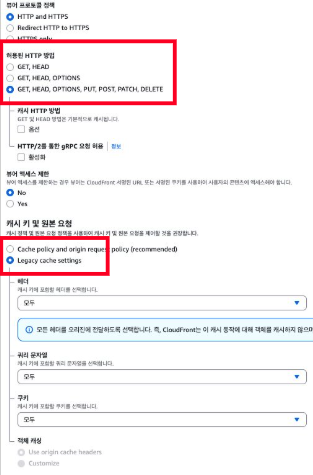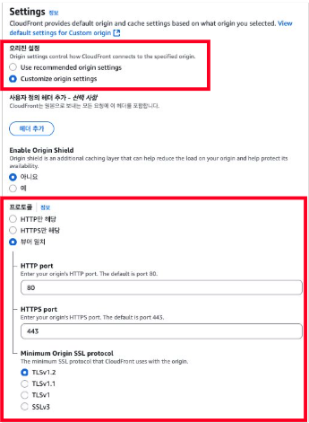 : Origin Domain(실제 서비스 실행 서버)로 요청값을 넘겨줘야 하기에 customize origin settings를 통해 헤더 및 프로토콜 등 조정