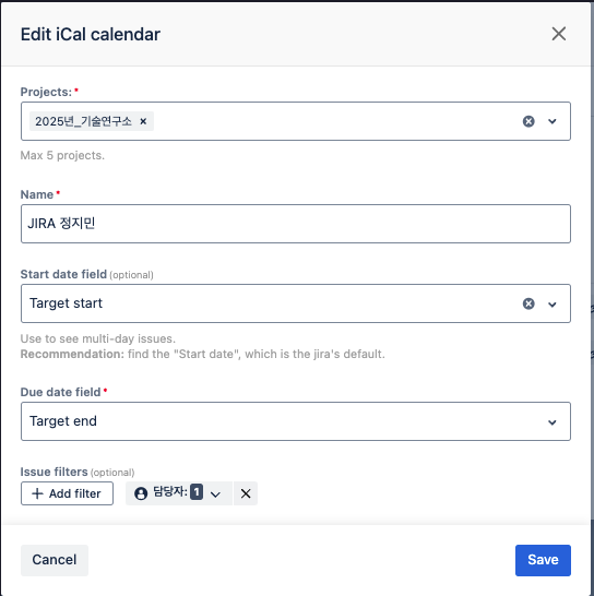 JIRA에 등록된 이슈 일정을 .ics 형식으로 가져와 Mac에서 직접 구독하는 방식