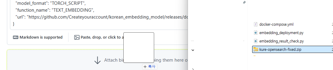 url의 경우 : https://github.com/Createyouracccount/korean_embedding_model_v3/releases/download/v1.3/korean-embedding-opensearch-fixed.zip 를 직접 구글 검색창에 넣어보면, 다운로드가 진행됨을 확인할 수 있습니다. 굳이 다운로드 받지 말고, 다운로드가 진행되는것이 확인된다면, 다음 단계로 넘어가겠습니다.